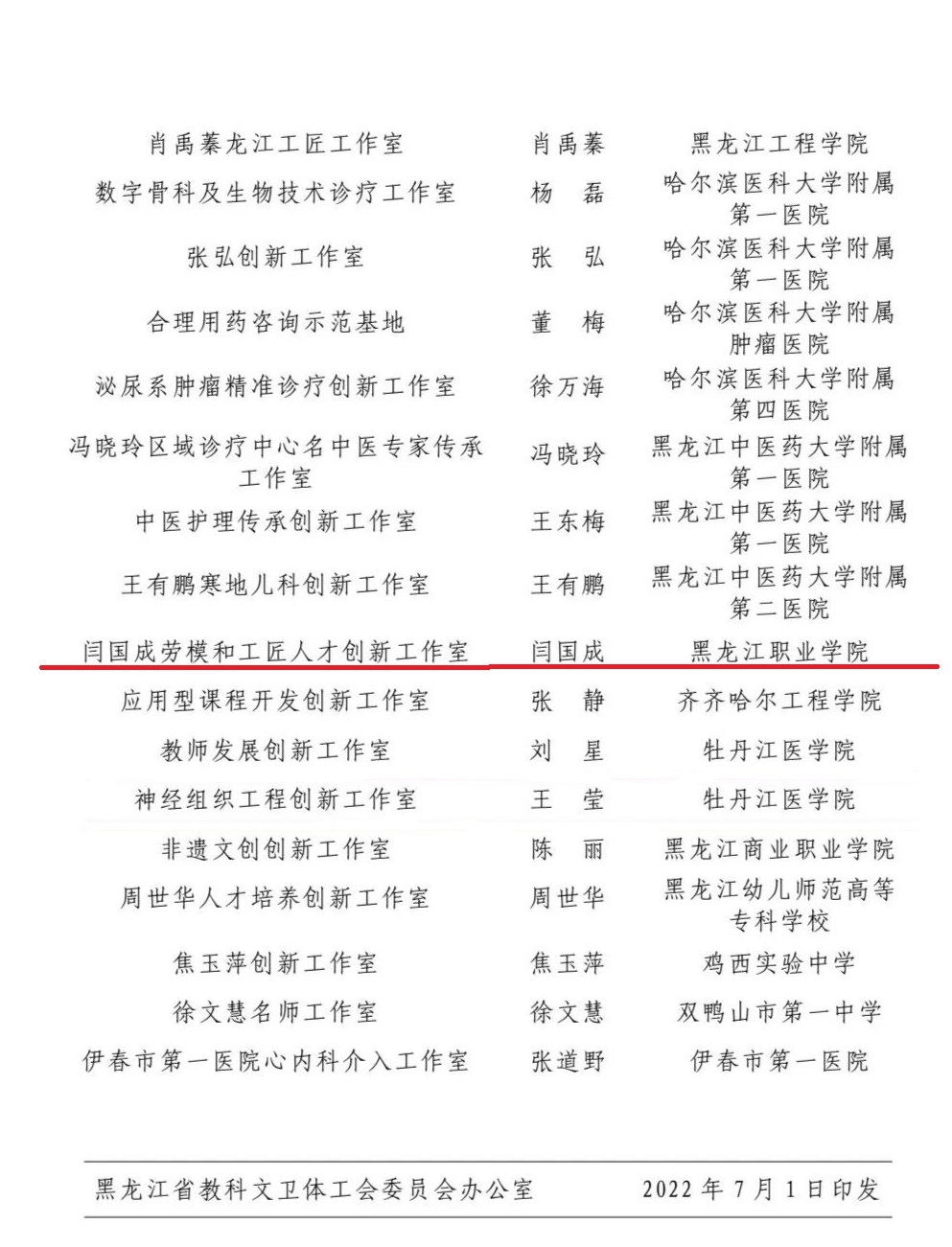 2022年度黑龙江省教科文卫体系统“劳模和工匠人才创新工作室”评审工作圆满完成,新葡京官网“闫国成劳模和工匠人才创新工作室”名列其中。