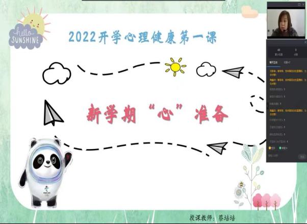 本次课程通过在线教学,以“新学期‘心’准备”为主题,重点讲授了“调整心情、拨云见月,改变思维、向阳而生,合理规划、迎风启航,你非孤岛、爱在身旁”四项内容,通过疫情常态化的案例分析帮助学生正视了“封校管理”,转变了“封校=失去自由”的固有思维,建立了“封校=自我管理能力挑战”正确的思维模式。同时,对学生做好返校前的情绪管理和压力释放也起到了积极的指导作用。