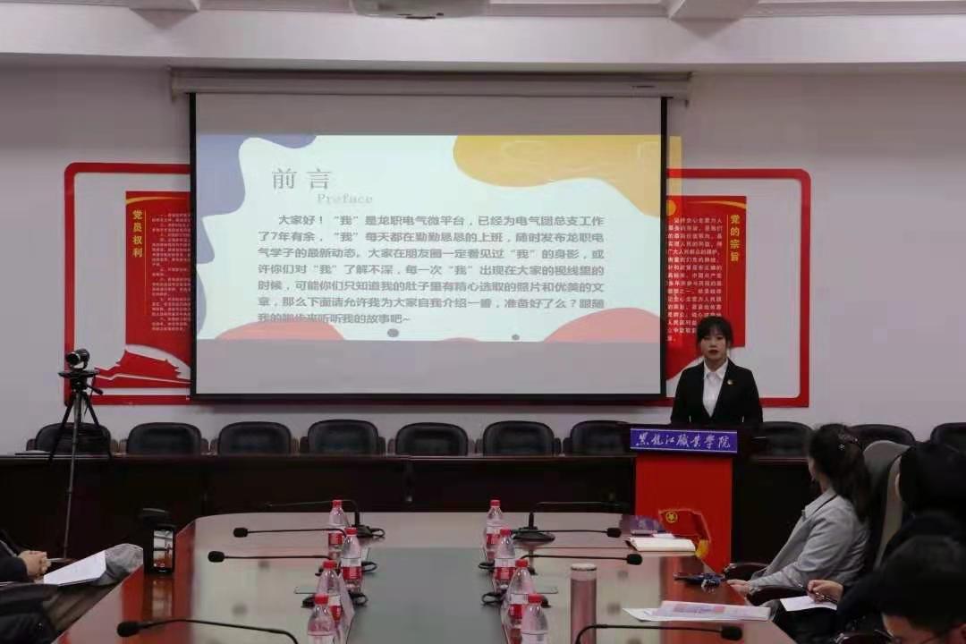 会上,九个二级学院官微公众号运营负责人从公众号的文化建设、队伍管理、制度建设、板块特色、数据分析、未来目标等方面用PPT作了述职汇报,充分展示了各二级学院“青春新媒体,龙职最强音”的精神风貌。