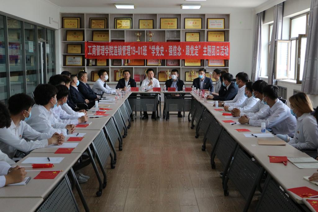 5月20日,团市委副书记王洪新在团市委学少部部长孙阅、干部马思行,市学联驻会执行主席张维韬陪同下,一行四人来新葡京官网调研指导共青团工作并参加了工商管理学院连锁管理2019-01班团支部“学党史·强信念·跟党走”主题团日活动。新葡京官网党委副书记周家郁亲切会见了王洪新副书记一行,并对他们来校指导共青团工作表示欢迎和感谢。校团委书记邹春雷、副书记杜超、兼职学生副书记刘丽利,校学生会执行主席刘昊凝以及各二级学院团总支书记参加活动。