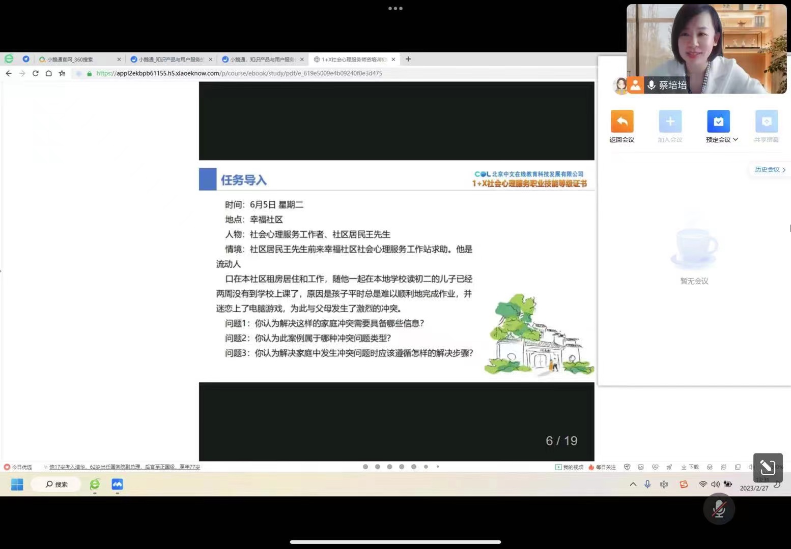 本次培训结合教育部“1+X”社会心理服务项目要求,使学生对1+X社会心理服务职业技能有了深入的认识,掌握了资料准备、宣教资料、效果评估、常见精神问题识别与评估、家庭/社区一般冲突识别、社会心理测评、伦理认识、关系建立、沟通技术实施的方式方法等。