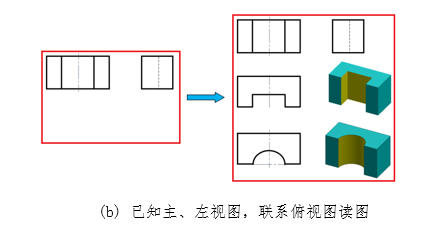 采用讲授法讲解两种常用的读图方法:形体分析法和线面分析法,并举例。形体分析法适用于形状和结构清晰的组合体读图,线面分析法适用于切割式组合体读图和视图难点部分的分析,如图4所示。