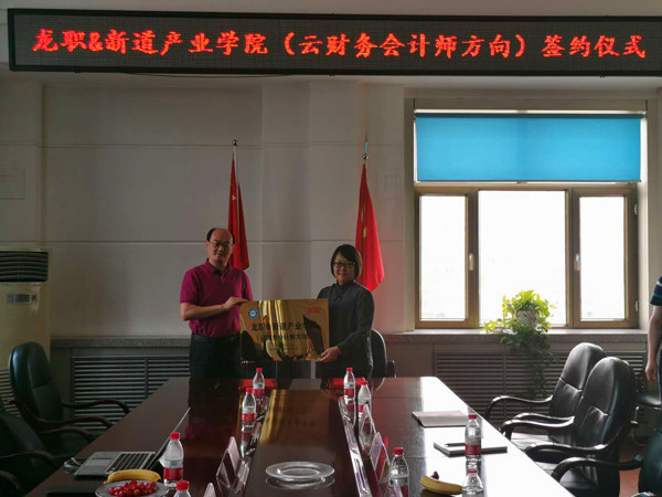 签约仪式由会计金融学院院长鞠永红主持。会议共分为五项内容:第一项,由鞠永红院长介绍分院情况。第二项,郑福贵副校长代表学校致辞。第三项,宋健副总裁代表新道科技股份有限公司发言。第四项,郑校长代表校方与宋健副总裁签订了校企合作协议。最后,宋健向鞠永红院长进行“龙职&新道产业学院(云财务会计师方向)”授牌。