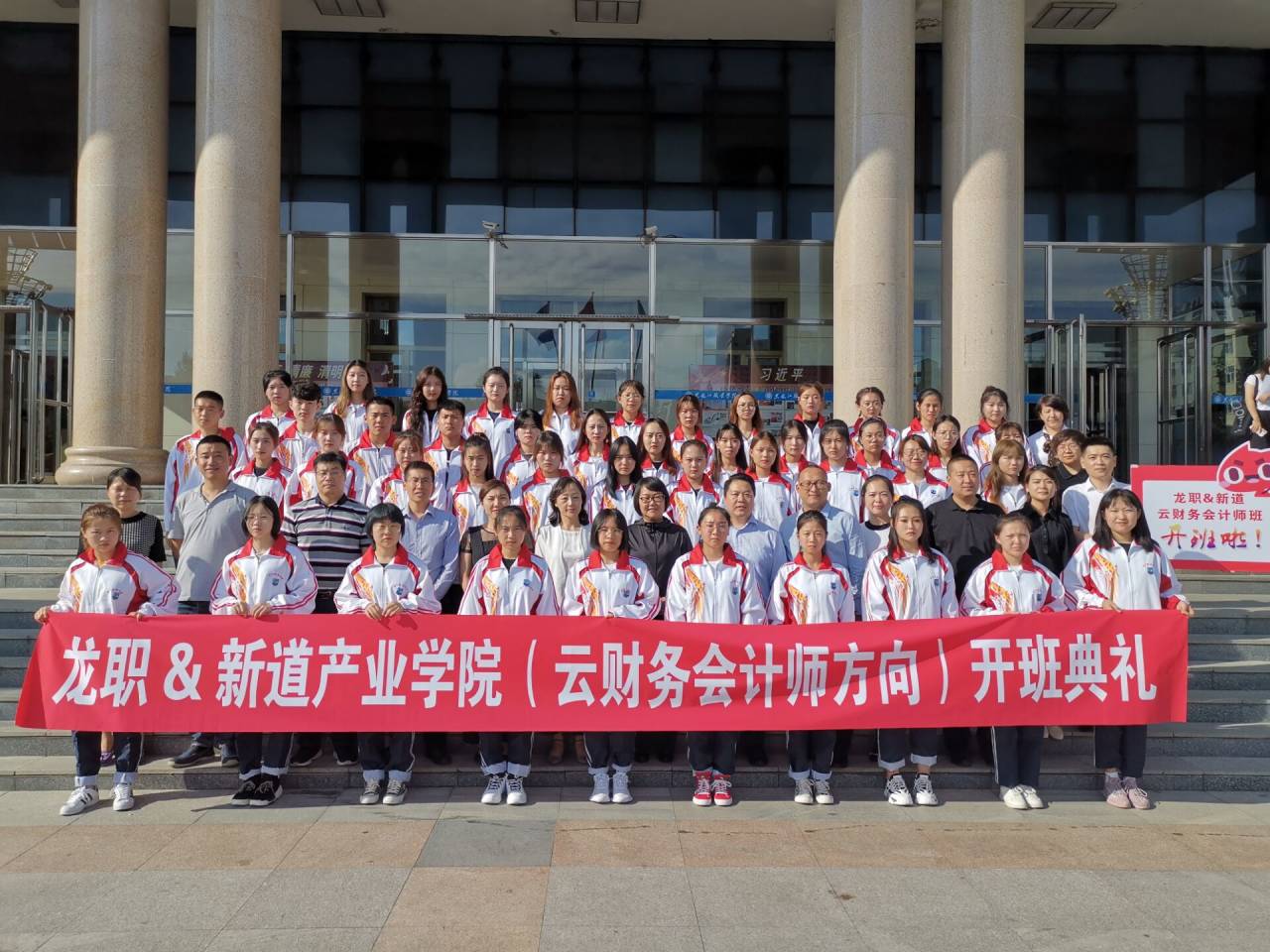 2019年9月6日,”龙职&新道产业学院(云财务会计师方向)”开班典礼在校经济报告厅如期举行。校长助理、会计金融学院院长鞠永红,党总支书记张雨薇,副院长张振和,党总支副书记、学管副院长石倩,新道科技教育服务事业部总经理刘志辉、教育教学总监冯建中、黑龙江省区总经理张海冰、黑龙江省区市场总监吴雪凌出席开班典礼。副院长张振和主持会议,会计金融学院会计信息管理团队教师代表、首批共建班45名同学列席开班典礼。