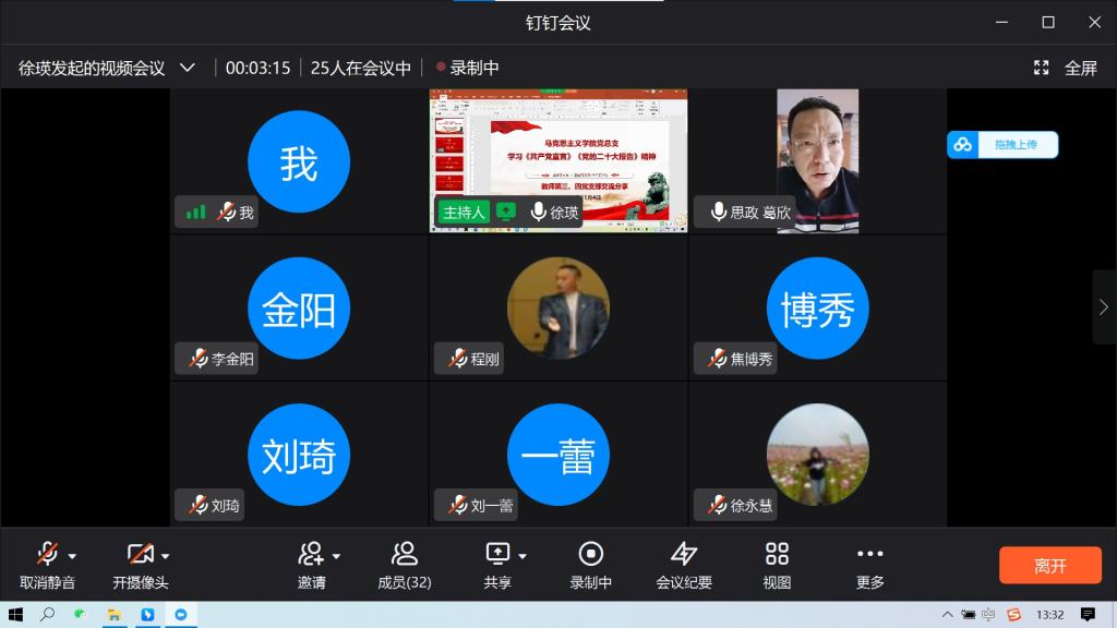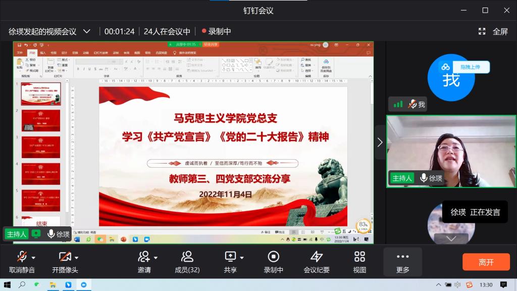 党的二十大胜利召开以来,在马克思主义学院党员中形成理论学习的新热潮。2022年11月4日下午1点30分,马克思主义学院党总支开展线上《共产党宣言》、学习贯彻二十大精神的学习活动,活动由教师第三、第四党支部组织,教师第三党支部徐瑛同志主持,马克思主义学院全体党员参加会议。学习内容主要包括《共产党宣言》和党的二十大会议精神的学习。