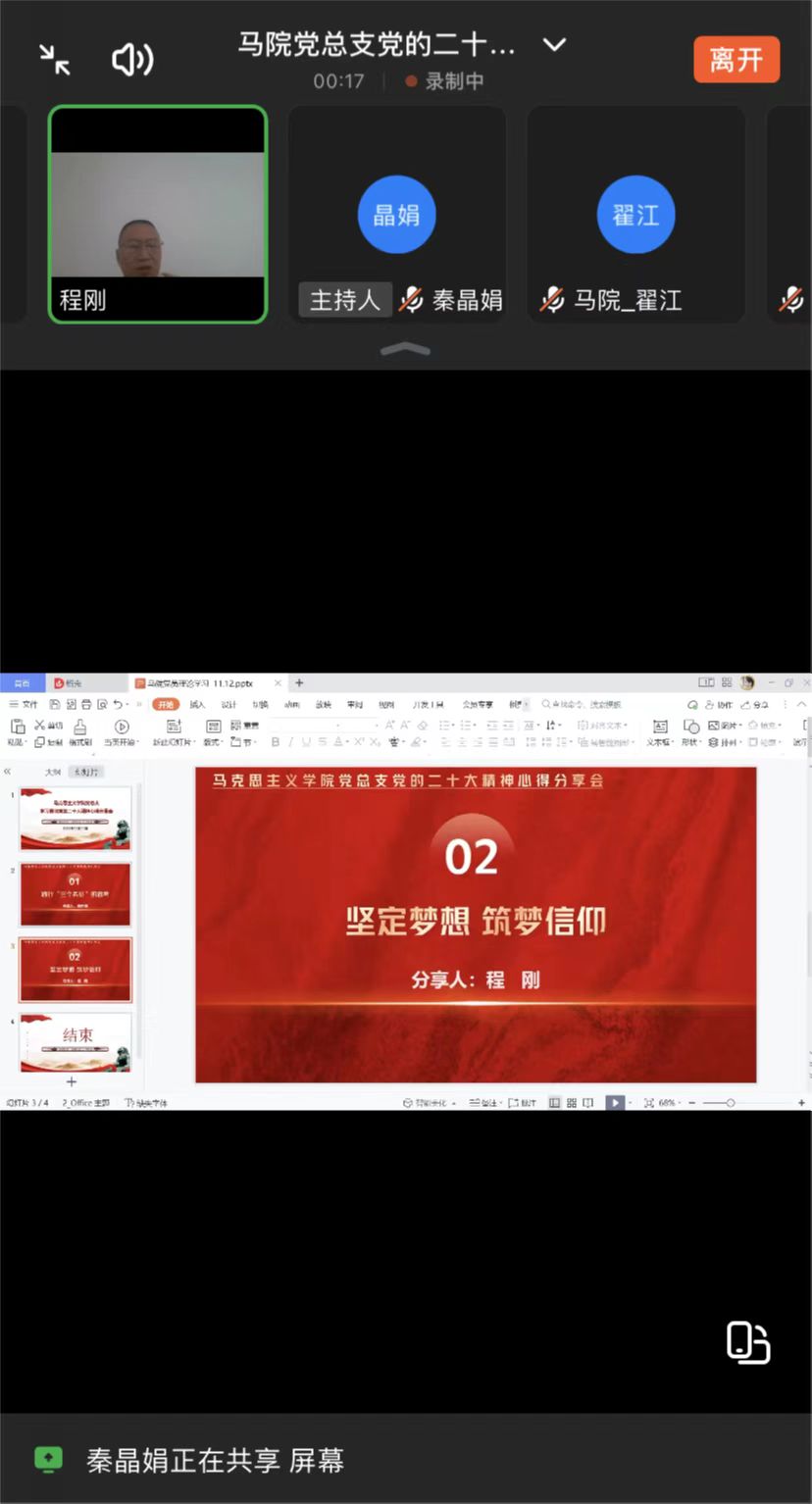 中国共产党第二十次全国代表大会是一次高举旗帜、凝聚力量、团结奋进的大会。学习宣传贯彻党的二十大精神是当前和今后一个时期全党全国的首要政治任务,马克思主义学院党总支认真贯彻落实学校关于学习贯彻党的二十大精神相关工作要求,于2022年11月11日下午1点30分钉钉线上召开学习贯彻党的二十大精神心得分享会。会议由党总支书记程刚主持,马院全体教师参会。