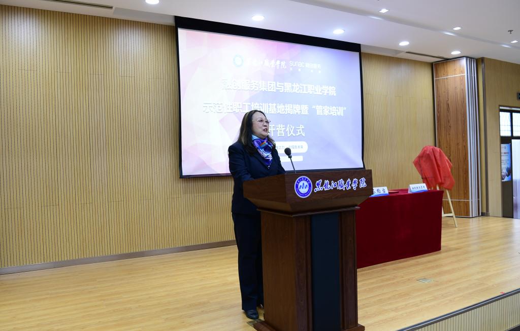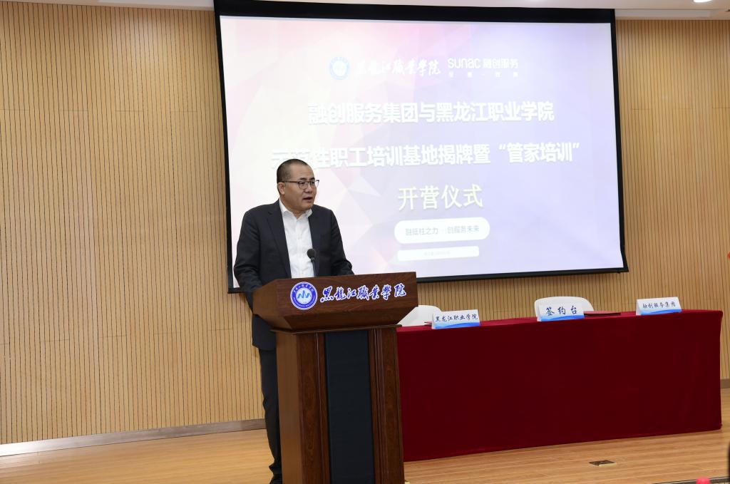 接下来,副校长王明海发表致辞。他首先介绍了当前党中央、国务院对于职业教育的重视程度,习近平总书记对职业教育提出了新的要求,肯定了职业教育的重要地位,指出了职业教育新的办学格局和方向。国务院出台了系列政策文件,倡议职业教育携手行业龙头企业,为国家发展培养高素质技术技能人才。接着,他介绍了学校的办学历史、办学理念和优势以及工商管理学院为服务龙江经济培养优秀人才的突出表现。他表示,学校将大力支持与融创服务集团的产教融合项目,希望双方在现有基础上开展更加深入的合作,开发出更多建设性成果。未来为龙江区域经济发展、融创集团发展、学校学院建设作出更加卓越地贡献。
