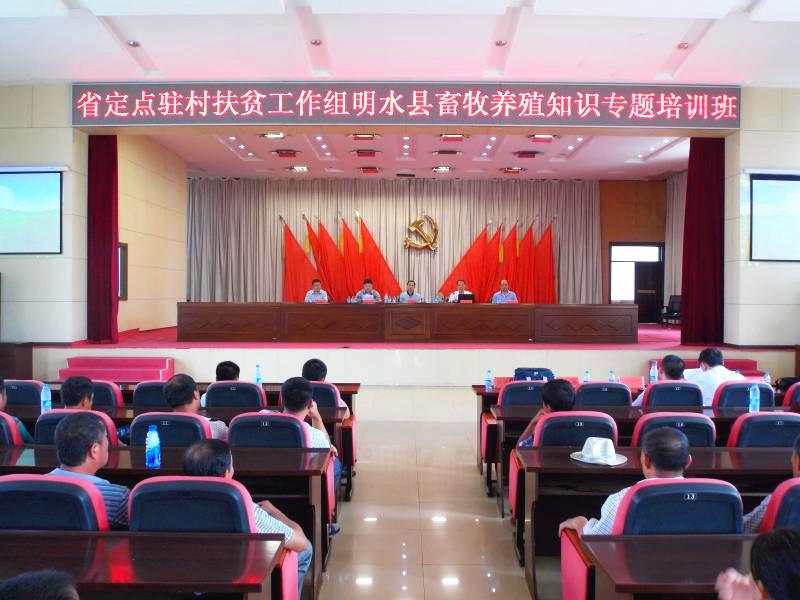 7月20日,在黑龙江省定点驻村扶贫第23工作组的带领下,黑龙江省畜牧兽医职教集团专家组奔赴明水县开展扶贫培训专题讲座。集团常务理事陈晓华教授、吴学军教授、集团专家、新葡的京集团350vip8888首页党委组织部长钟敏强,孙英杰教授前往参加。明水县副县长付忠、明水县扶贫办副主任王富鹏及明水县畜牧兽医局技术人员、乡镇主管农牧业副乡长、乡镇畜牧技术服务中心技术人员与养猪场(户)、养肉牛、肉羊场(户)负责人等430多人参加了畜牧养殖知识专题培训。